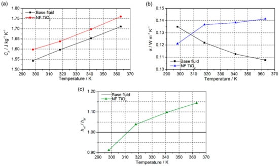 (a) Isobaric specific heat, (b) thermal conductivity, and (c) ratio of the heat transfer coefficient between TiO2-nanofluid and the base fluid.