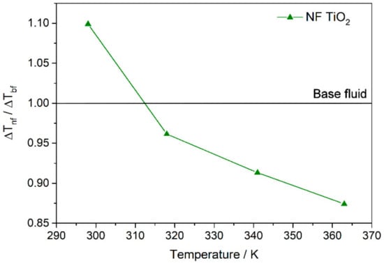 Finally, to check the heat transfer performance of the TiO2-nanofluid with regard to the base fluid, the results obtained were replaced in Equation (2). Thus, the ratio of the heat transfer coefficient of the nanofluid with regard to the base fluid was estimated at the temperatures at which the thermal conductivity and isobaric specific heat were measured. Figure 8c shows the values obtained. The efficiency of the heat transfer process is usually considered to have improved when is greater than 1. Thus, an enhancement in the efficiency of the heat transfer process of 14.4% at 363 K was found for the nanofluid.