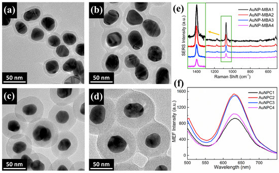 (a–d) TEM imaging of AuNP@SiO2-1-4; (e) SERS spectra of the AuNP-MBA1-4; (f) MEF spectra of the AuNPC1-4.