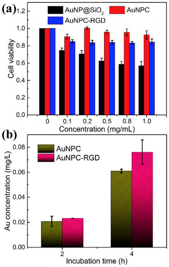 For the evaluation of in vitro cytotoxicity, the MTT assay was performed on the HeLa cells [3]. Briefly, 100 μL of HeLa cells (1 × 105 cells per mL) was added in 96-well plate with the incubation of 24 h. Then the culture medium was removed and 100 μL of AuNPC-RGD (0–1.0 mg/mL) in fresh culture medium was added and incubated for another 24 h. Next 10 μL of MTT (5 mg/mL) was added and incubated for 4 h, then 100 μL of DMSO was added after removing the medium and free MTT. The absorbance of the suspension was recorded by a microplate reader (Thermo MultiskanFC, Waltham, MA, USA) at a wavelength of 570 nm.