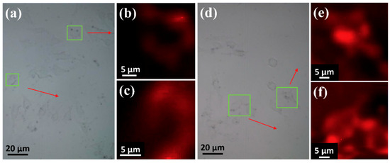 To investigate the performance of the nanoprobe for SERS imaging, HeLa cells were incubated with AuNPC or AuNPC-RGD. Figure 4a shows the bright field cell imaging of HeLa cells incubated with AuNPC, and Figure 4b,c are the corresponding SERS images, in which the Raman signals were collected in the range of 1065–1080 cm−1 and the excitation wavelength was chosen as 633 nm to avoid fluorescence interference [19]. The SERS images of Figure 4b,c are enlarged views of the cells in the green boxes in Figure 4a, which are well matched with the corresponding bright field images. SERS images of HeLa cells incubated with AuNPC-RGD are exhibited in Figure 4d–f. Similar to AuNPC, Figure 4d shows the bright field imaging of the cells and Figure 4e,f are the SERS images under the same conditions as mentioned above, and both the bright field and SERS images are again completely matched. Compared with Figure 4b,c, the SERS intensities of Figure 4e,f are much brighter, which can be ascribed to the higher cellular uptake of AuNPC-RGD than AuNPC. The very close matching of the SERS images with the bright field images indicates that the SERS nanoprobes can achieve single-cell imaging.