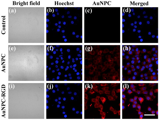Laser confocal microscopy images of HeLa cells incubated with/without nanoparticles. (a–d) Without nanoparticles; (e–h) with AuNPC; (i–l) with AuNPC-RGD (i–l). Hoechst and AuNPC were excited at the same wavelength of 405 nm, and the fluorescence images were taken at 420–480 and 600–660 nm, respectively. Scale bar: 50 μm.