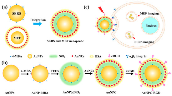 In summary, we have developed new nanoprobe for SERS and MEF dual functional imaging to achieve fast and long-lasting imaging for early cancer. AuNPs of about 35 nm in size are modified with a Raman reporter molecule of 4-MBA, encapsulated with SiO2, grown AuNCs on the surface, and functionalized with BSA and cRGD to construct the dual functional (i.e., SERS and MEF) probes, denoted AuNPC-RGD. To maximize the stability, SERS intensity and MEF intensity of the AuNPC-RGD nanoparticles, the concentration of 4-MBA was optimized to be 500 µM, and the thickness of SiO2 was optimized to be about 13 nm. The TEM and DLS results indicate the monodisperse AuNPC-RGD, with a negative surface charge that suppresses the non-specific interaction with cells. From the SERS and MEF spectra, the calculated EFs of AuNPC-RGD are 500 and 2, respectively. Moreover, cell viability in the presence of 1 mg/mL AuNPC-RGD is 84.3%, indicating the outstanding biocompatibility of the nanoprobe. For application in SERS and MEF imaging, our AuNPC-RGD nanoparticles exhibit excellent imaging abilities, which suggest that the AuNPC-RGD composite is a powerful probe for accurate and effective cancer imaging.