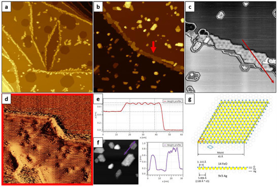 (1) Islands exhibiting a 45 Å Moiré superstructure—virtually identical to the one observed on the RT-FeO/Ag(111) sample—some of which were growing on top of silver terraces and some were embedded into the top silver layer. An example of such an island is marked with a red arrow in Figure 3c;