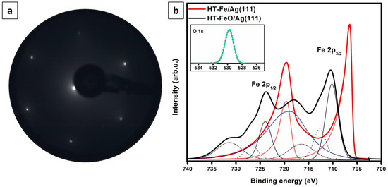 LEED pattern (60 eV) of 0.5 ML FeO film grown by Fe deposition onto Ag(111) substrate kept at 550 K and post-oxidation (a). (b) shows XPS Fe 2p spectra obtained for the 1.0 ML HT-Fe/Ag(111) (red line) and 1.0 ML HT-FeO/Ag(111) (black) samples. The Ag 3s signal is marked in blue. Inset in (b) presents the O 1s spectrum (green line) recorded for the oxidized sample.