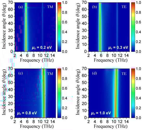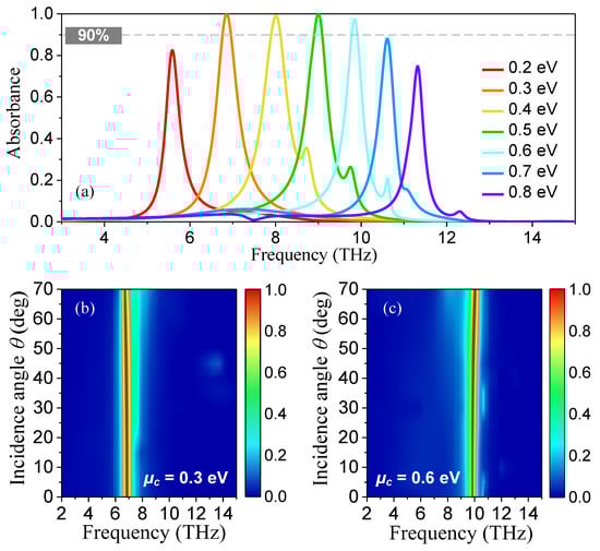 - Li, H.; Wang, L.; Zhai, X. Tunable graphene-based mid-infrared plasmonic wide-angle narrowband perfect absorber. Sci. Rep. 2016, 6, 36651. [Google Scholar] [CrossRef] [PubMed]