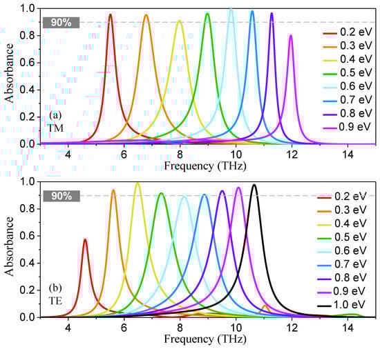 - Wu, J. Tunable ultranarrow spectrum selective absorption in a graphene monolayer at terahertz frequency. J. Phys. D. Appl. Phys. 2016, 49, 215108. [Google Scholar] [CrossRef]