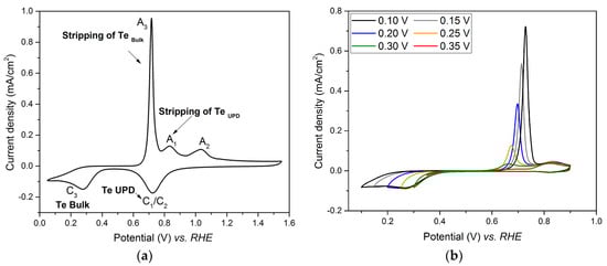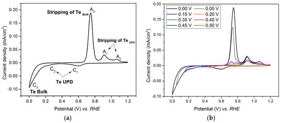 The reduction of TeO2 started at 0.7 V vs. RHE (peak C1), in agreement with previous work attributing this reduction to the first tellurium UPD peak [31,32,33,34]. The second peak (C2), occurring at the lower potential of 0.4 V vs. RHE, has also been already reported [32,33] and is referred to as the second tellurium UPD, which is only partially resolved from the bulk reduction peak. It is known that the UPD peak shape and potential strongly depend on the crystallographic plane on which it occurs [35,36,37]. This can explain the slight shift between the UPD potential observed in this work, and those reported in the literature [38].