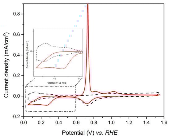 The electrodes were then treated electrochemically using cyclic voltammetry (CV) in a blank solution. To clean the working electrode, 40 cycles from −0.30 V to 1.65 V vs. RHE with a scan rate of 100 mV/s were performed until a reproducible voltammogram was obtained (Figure S1, Supporting Information, SI).