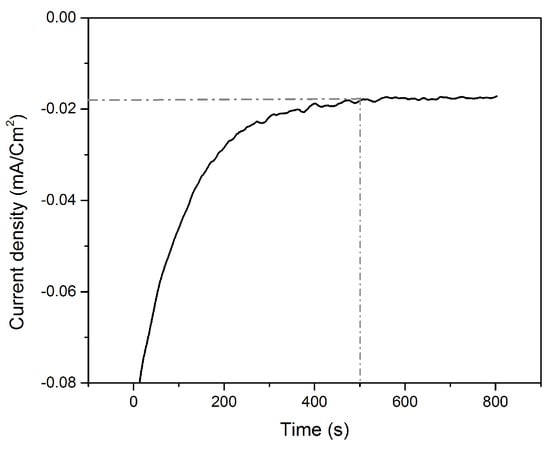 Chronoamperometric curve of the galvanic replacement of Te by Pt at open circuit voltage (OCV).