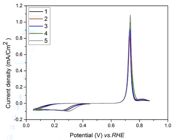 The voltammograms obtained on a Pt-covered gold electrode immersed in Te solution after various numbers of replacements (from 1 to 5) are presented in Figure 5. The Au electrode was scanned from 0.45 V to 0.05 V vs. RHE and then up to 0.87 V vs. RHE only, in order to avoid the oxidation of the Pt layer obtained by the previous replacements. One can observe that the intensity of the Te UPD peak increases with the number of replacements and that its potential (0.35 V vs. RHE) is similar to that determined on a platinum bulk electrode (Section 3.2). This latter result is not surprising, since the electrical resistivity of the Pt layer should be very low.