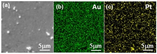 SEM image (a) and energy dispersive X-ray spectroscopy (EDS) mapping showing (b) Au and (c) Pt chemical contrasts for the Pt layer deposited on the gold-coated glass slide after 5 cycles of Te deposition and Pt replacement.