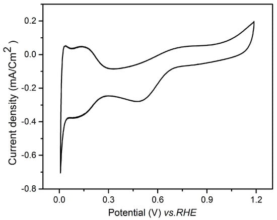 Figure 9 presents a cyclic voltammogram recorded in the range 0.05–1.2 V vs. RHE after five galvanic replacements on the Au electrode. The CV demonstrated the successful deposition of Pt, exhibiting the three characteristic regions of this metal: the hydrogen adsorption/desorption peaks in the potential range between 0.05–0.35 V vs. RHE, the double layer capacitance, and the Pt oxide formation with the corresponding reduction [41]. It should be noticed that the CV presents a certain distortion and asymmetry, probably due to resistive effects, because of the ultra-low amount of Pt and thus difficult electrical connection of the electrode.