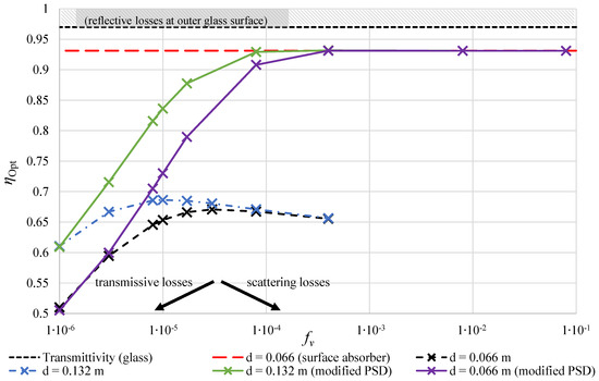 - Solely, a high particle fraction does not necessarily improve the optical efficiency of a volumetric solar thermal absorber. Whereas transmission lowers the optical performance for small , scattering deteriorates the performance at high (see Figure 3).