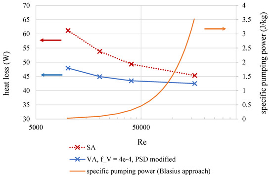 The first aspect to be considered is the influence of flow rate on the thermal losses from the absorber surface along a section of l = 5 m length. For that, the surface absorber was directly compared with a volumetric absorber at different mass flow rates, which is shown in Figure 4. For the case of the surface absorber, the heat flux is absorbed at the outer surface and must be transported into the fluid by forced convection. The highest Reynolds number (Re = 1.6 ) depicts a mass flow rate of = 8 kg/s at which surface absorbers commonly operate [16]. At such Reynolds numbers, the heat transfer rate is so high that the absorber tube shows a lower temperature and thus lower thermal losses. It can easily be seen that a decrease of flow velocity results in a higher heat loss. Regarding the pumping power, elevated Reynolds numbers have a negative impact. The orange line in Figure 4 shows the mass flow specific pumping power for the flow. The function has been calculated using the Blasius approach for the pressure loss. It can be seen that higher Reynolds numbers cause higher operational costs due to an increased energy demand for pumping.