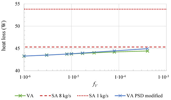 Figure 5 shows the heat loss over the same section as before for different volume fractions . The heat loss for the surface absorber at two different mass flow rates are given as constant lines for comparison. It can be seen that the heat loss of the volumetric receiver, which is shown for = 1 kg/s, increases with , however remains at a lower level even than the SA at = 8 kg/s. It must be considered that the higher mass flow causes a lower average outlet temperature as the thermal capacity flow increases. The difference between the thermal losses of the VA with the actual and the modified PSD is low.