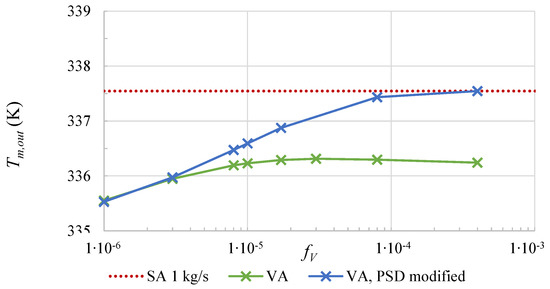The average fluid temperature at the outlet as a function of the volume fraction of the VA (solid lines) at a mass flow rate of = 1 kg/s. For comparison, the average fluid temperature of the SA is shown as red dotted line.