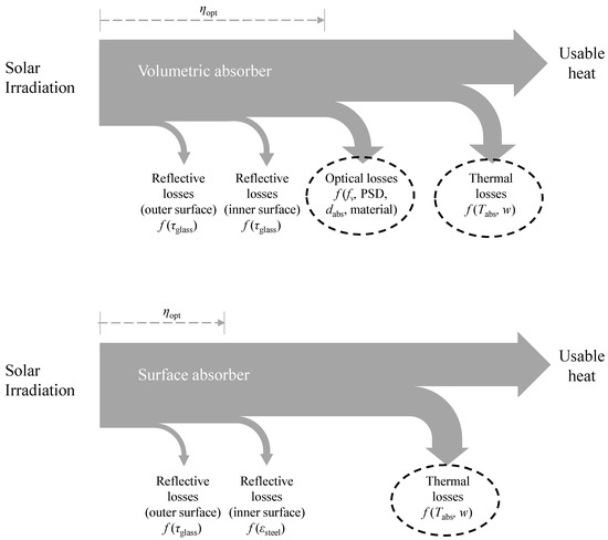 For the volumetric absorbers, the radiation has to travel through another glass surface with a transmittance . The optical efficiency is defined as follows: