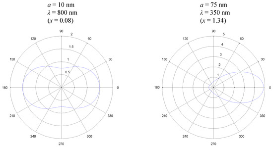 The following calculations of the radiative properties are performed using a mathematical derivation that can be found in [42,43]. For each size parameter , with the particle radius a, the refractive index of the medium and the vacuum wavelength of incident radiation , the Mie parameters and can be calculated: