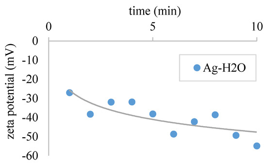The experiments were conducted immediately after the preparation process to avoid errors due to agglomeration and settling effects. To show that the Ag-HO Nanofluid is stable for some time, the zeta potential was measured for 10 min immediately after the sonication process using a Brookhaven ZetaPals measurement system. Stability can be seen in Figure 14 since the zetapotential exceeds an absolute value of at least 30 mV [51,52].