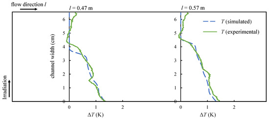 To evaluate the measurements, the temperature difference , being the difference of the local temperature and the free flow temperature at the nanofluid surface orthogonal to the channel wall, is given in Figure 15. Measured (green solid line) and simulated (blue dashed line) values are shown at a channel length of l = 0.47 m and l = 0.57 m for the lower flow rate of = 7.7 mL/s.