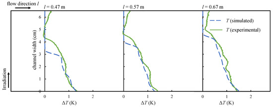 Figure 16 shows the results for an increased flow rate of = 9.5 mL/s at three different channel sections (l = 0.47 m, l = 0.57 m and l = 0.67 m). The shape of the temperature curve is similar to the case of lower flow velocity. The simulation matches the experimental results though at low channel lengths the thermal boundary layer is calculated to be slightly too thin. The thickness of the thermal boundary layer increases with the channel length and the difference between simulation and experiment becomes smaller. The temperature at the channel wall is calculated with good precision for all situations. Although the experiments have been repeated, the measurement uncertainty is hard to quantify due to varying parameters, such as channel position or flow rate. Additionally, the duration of the experiments proved as a factor too, since impurities in the channel material led to absorbing radiation. Regarding the temperature measurement, the depth of the thermal radiation signal was neglected. Therefore, only temperature differences have been validated, since the measurement accuracy of the IR camera is very high. Besides, the complex structure of the setup allows for further sources of uncertainty such as the measurement of the mass flow as well as the measurement of the radiation intensity of every single halogen lamp especially regarding the angular dependence irradiation on the channel. However, in general, it can be seen that the results seem to agree to a certain rate.