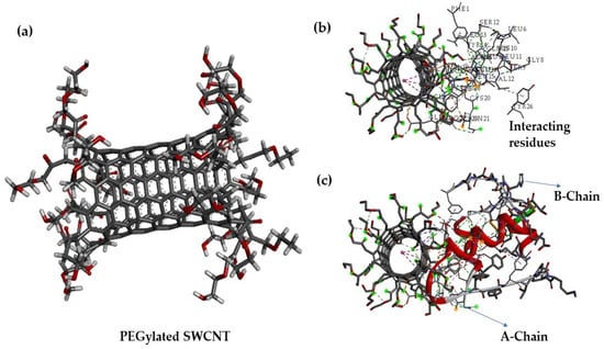 Three-dimensional representation of, (a) covalently functionalized single-walled carbon nanotubes with polyethylene glycol (PEGylated SWCNTs); (b) binding site interactions among insulin and PEGylated SWCNTs predicted by FireDock webserver; and (c) the binding of insulin A-chain and B-chain onto PEGylated SWCNTs. All interactions are visualized using the Discovery Studio visualizer.