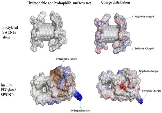 Representation of hydrophilic, hydrophobic, and charge distribution over the non-covalent functionalization of insulin hormone on PEGylated SWCNT and PEGylated SWCNT alone. The Discovery Studio visualizer is used for visualization of the hydrophobic, hydrophilic and charge surfaces.