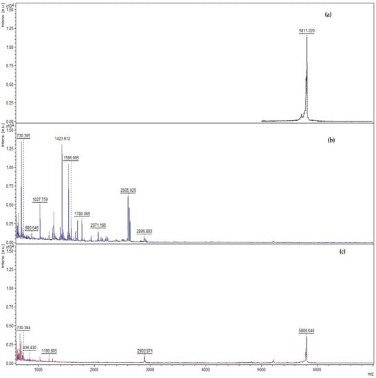 Qualitative study results obtained from MALDI-TOF spectrum, revealing the role of functional dispersion (insulin–PEGylated SWCNTS) to protect insulin from proteolytic enzyme pepsin: (a) pharmaceutical regular insulin; (b) pharmaceutical insulin incubated for 30 min with pepsin enzyme; and (c) functional dispersion of insulin PEGylated SWCNTs incubated with pepsin for 30 min.