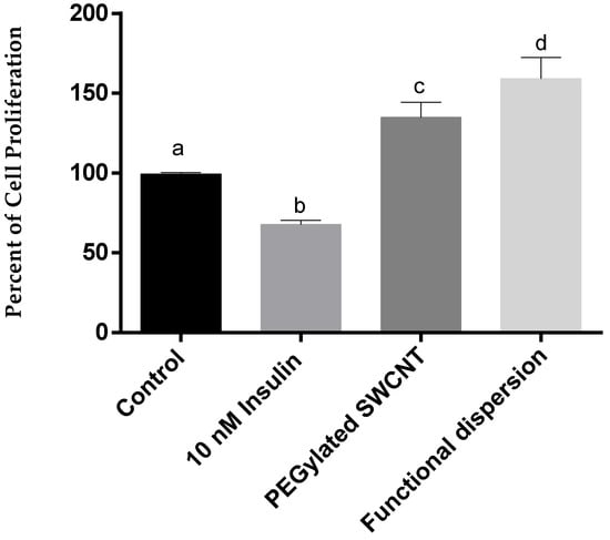 Percent of cell proliferation of rat L6 skeletal muscle cell lines treated with 10 nM insulin, 5 µg/mL PEGylated SWCNT, Functional dispersion (10 nM insulin and 5 μg/mL PEGylated SWCNT) for 24 h. Means with different letters are significantly different at p < 0.05 calculated using the two-tailed unpaired t-test. All data are represented as the mean ± S.D of triplicates.