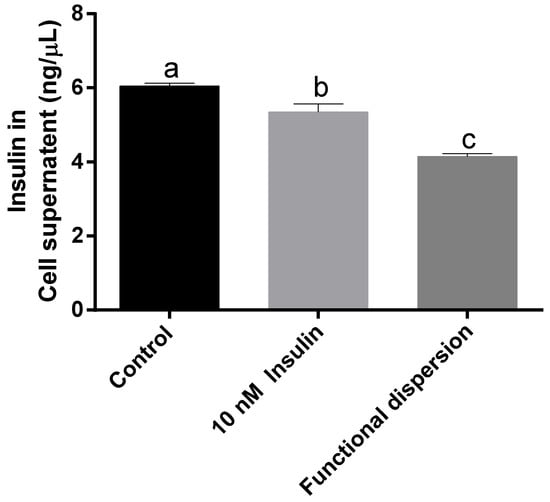 The amount of insulin in the cell supernatant of rat L6 skeletal muscle cell lines alone, and cells given 10 nM insulin and treated with functional dispersion for 24. Means with different letters are significantly different at p < 0.05 calculated using the two-tailed unpaired t-test. All data are represented as the mean ± S.D. of triplicates.