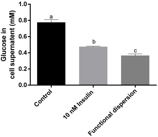 The amount of glucose in the cell supernatant of rat L6 skeletal muscle cell lines alone as control, and treated with 10 nM insulin and functional dispersion for 24 h. Means with different letters are significantly different at p < 0.05 calculated using the two-tailed unpaired t-test. All data are represented as the mean ± S.D. of triplicates.