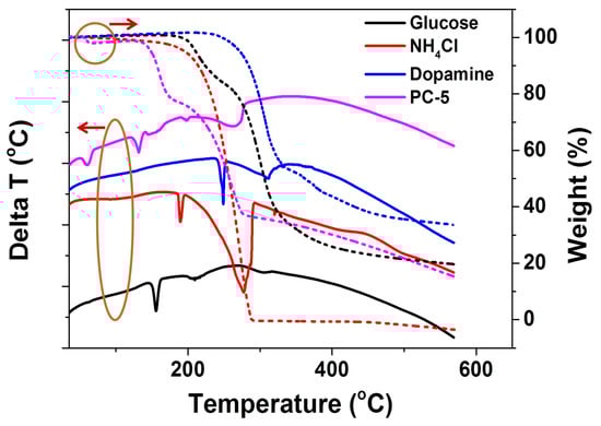 Porous carbon could be synthesized through the direct pyrolysis of a glucose, DAH, and NH4 Cl mixture at a specific heating rate under an inert atmosphere, as shown in Figure 1. In this process, a melted viscous mixture of glucose and dopamine was gradually polymerized, whereas chemically released gases (NH3, HCl) from NH4Cl and DAH blew glucose-derived polymers, such as melanoidin, into numerous large bubbles, which featured sugar blowing. The bubble walls were gradually thinned by the gas release, the blowing, the surface-tension induced drainage of the polymer fluid out of the walls, and the elimination of small molecules from the polymers. The polymer walls were subsequently carbonized into an ultrathin sheet at a high temperature. The presence of dopamine reacted with glucose to form different glucose-derived polymers which affected the resulting carbon nanostructures. DTA and TGA were used to confirm the process. In the DTA profiles (Figure 2, solid lines), the three endothermic peaks during heating glucose alone corresponded to melting, water elimination, condensation, and polymerization. The two peaks of NH4Cl related to the crystal transformation and decomposition. Two endothermic peaks during heating dopamine hydrochloride alone corresponded to melting, condensation, and polymerization. In the pyrolysis of the mixture of glucose, dopamine hydrochloride, and NH4Cl, the reaction process is different. In the TGA curve of the PC-5 precursor (Figure 2, dash lines), the first mass loss occurs at 65 °C, which is much lower than that of the mixture of glucose and NH4Cl in the absence of DAH (130 °C) [24], presumably resulting from the water loss of the condensation of aldohexose and dopamine to N-substituted glucosylamine derivative. Then the mass loss occurs at 150 °C, presumably resulting from the water loss of the condensation of aldohexose and ammonia to N-substituted glucosylamine. Glucosylamine and its derivative become ketosamine derivatives after a quick cyclization and Amadori rearrangement (the 1st step of the Maillard reaction). In the DTA profile, the strong endothermic peak at 131 °C should result from melting, followed by a series of endothermic peaks (145–165 °C) which are dominated by the 2nd step of the Maillard reaction. In the 3rd step of the Maillard reaction, condensation and polymerization of the active intermediates produced in the 2nd step occurred. Diverse fragments such as nitrogenous heterocyclic compounds are lost. Meanwhile, the condensation and polymerization of dopamine and the decomposition of NH4Cl occurred, which contributed to the strongest mass loss noted around 250 °C. After that, the unstable O-containing and N-containing groups were lost slowly in the elevated temperature.