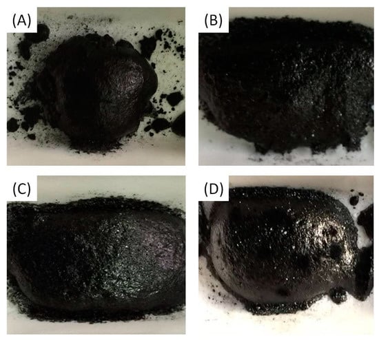Photographs of porous carbon, (A) PC-0, (B) PC-1, (C) PC-5, (D) PC-10.
