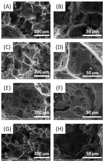 Typical SEM images of porous carbon, (A,B) PC-0, (C,D) PC-1, (E,F) PC-5, (G,H) PC-10.