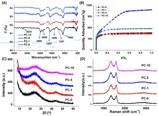 The FTIR characterization gave some information on the chemical structure of porous carbon (Figure 5A). Compared to the IR spectra of glucose and dopamine (Figure S3 and S4), the broad band around 3670 cm−1, which was assigned to the N−H and O−H stretching mode, nearly disappeared, indicating that most of the O-containing and N-containing groups had been removed after carbonization. The peaks at 2980 cm−1 and 2895 cm−1 were related to the C−H stretching mode, and the peak at 1060 cm−1 was attributed to the C−H in-plane deformation, suggesting the existence of hydrogen residue after carbonization. The peak at 1557 cm−1 was assigned to the stretching of aromatic C−C bonds of carbon. The peak at 1400 cm−1 was attributed to the heterocyclic stretching, while the peak at 1221 cm−1 was attributed to the phenol C–OH stretching, indicative of the existence of O-containing group residue. Due to the low addition of dopamine, the products, even PC-10, did not show any special absorption peaks of dopamine derivatives (for example, 1507 cm−1 of the C−N bending, 1157 cm−1 of the heterocyclic N−H in-plane deformation breathing).