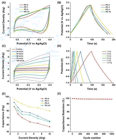Figure 6B compares the galvanostatic charge/discharge (GCD) curves of all PC electrode materials at 1 A/g current density, which was a more accurate method to measure the capacitance value. All GCD curves show a nearly linear and symmetrical with a slight curvature shape, implying good electrical double-layer capacitive behavior with little pseudo-capacitance. Similarly, the PC-5 electrode showed the longest discharge time, meaning it had a larger capacitance value than other samples, which was in agreement with the result above the CV curves. Furthermore, the CV and GCD curves of PC-5 over various scan rates and current densities were systematically investigated. All CV curves (Figure 6C) retained a quasi-rectangular shape, suggesting the approximately ideal EDLC nature. More importantly, the CV curves kept the quasi-rectangular shape even at a high scan rate of 100 mV/s, suggesting the efficient ions transfer and the fast charge response capacity inside the PC-5 electrode. All GCD curves of PC-5 (Figure 6D) exhibited a quasi-triangular and symmetrical appearance, indicating excellent super-capacitive behavior and electrochemical reversibility, which was consistent with the result of the CV curves. The specific capacitance of the PC-5 electrode was 96.7 F/g calculated from the discharge curve at 1 A/g. Besides, the voltage drop at the initiation of the discharge at a high current density of 10 A/g was only about 0.01 V, implying a low internal resistance, which should benefit from the graphitized carbon structure, endowing the prominent electric conductivity. To determine the capacitive rate capacity, the correlations between specific capacitance and current densities of all PC electrodes were shown in Figure 6E. The capacitance value gradually decreased with the increase of the current density, which was related to the increase of the diffusion limitation. The PC-5 not only had the largest specific capacitance, but also had the best rate capacity among all porous carbon samples. The specific capacitance could still maintain itself at 80%, even at a high current density of 10 A/g, benefiting from their great porosity [29]. Cycling performance was another important factor in determining the supercapacitor electrodes for many practical applications. The cycling stability of PC-5 was examined using GCD cycling at a current density of 1 A/g (Figure 6F). During the 1000 cycles, the specific capacitances were almost constant (98.1% capacitive retention after 1000 cycles), which demonstrated good cycling performance.