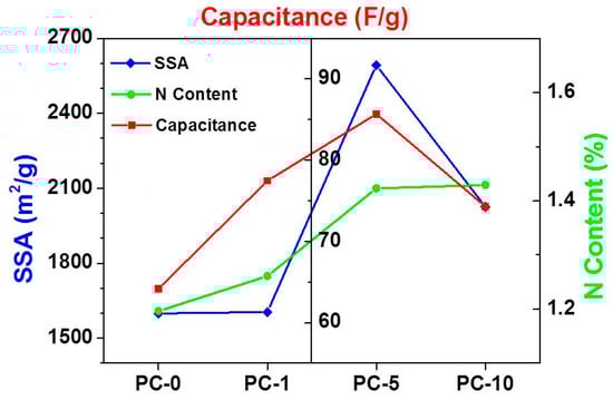 It is well known that there are two important factors that influence the specific capacitance of porous carbon materials. The first is the amount of doped heteroatoms, such as nitrogen, which is capable of providing pseudo-capacitance. The second is the SSA of the materials, which is the key factor for the accommodation of electrolyte ions [43]. By increasing the content of dopamine in the precursor mixture, the varying trend of SSA, N content, and capacitance become visible, as shown in Figure 7. The SSA of porous carbon increases first and then decreases with the increasing amount of dopamine. The trend of capacitance changes exactly the same as the trend of SSA. Although the content of N increases by increasing the amount of dopamine, the content of N is generally small in all samples, and the corresponding pseudo-capacitance is also small. The specific capacitance of the porous carbon material is determined by the specific surface area of the porous carbon materials.