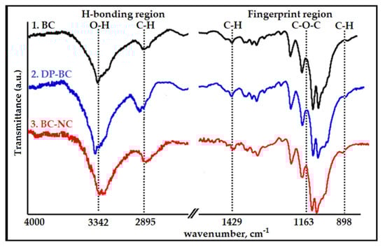 FT-IR spectroscopy was used to investigate changes in the chemical structure of cellulose sample before and after the treatments. The spectra displayed the intensity of absorption of the functional groups between 4000 and 400 cm−1, which can identify the chemical bond in the cellulose molecule. The absorption bands for characteristic chemical groups of the raw material (native BC) and the treated celluloses (DP-BC and BC-NC) can be observed in Figure 1, and the typical vibration bands are listed in Table 1. The FT-IR spectra were divided into two parts: (1) H-bonding region from 4000 to 2600 cm−1, and (2) fingerprint region from 1800 to 400 cm−1 [46]. The broad peak in the 3650–3000 cm−1 bands was assigned to O–H stretching vibrations, which are characteristic of the hydroxyl groups generally present in cellulose, water, and lignin. In this region, intramolecular hydrogen bonds appeared at 3342 cm−1 and 3432 cm−1, and were attributed respectively to the two crystalline cellulose allomorphs, cellulose Iα and cellulose Iβ [47].