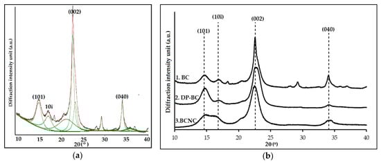 There were at least eight peaks that had been separated from the diffraction intensity profiles but only four distinct characteristic peaks at 2θ = 14.6°, 16.8°, 22.6°, and 34.1°, which were considered to correspond to 101, 10ī, 002, and 040 crystallographic planes [54,55]. The broad peaks were attributed to the amorphous contribution. The assumption for this analysis was that the amorphous contribution increase was the main contributor to peak broadening. According to Park et al. [45], the other intrinsic factors that influence peak broadening were crystallite size and non-uniform strain within the crystal. These assumptions were then utilized to carry out an investigation of the crystallinity for all the samples. After subtracting the amorphous regions from the whole samples, the CrI was calculated by dividing the remaining diffractogram area due to crystalline cellulose by the total area of the original diffractogram. The samples presented correspond to the optimum results of the partial depolymerization step (DP-BC) which have been further hydrolyzed into the microwave reactor (BC-NC).