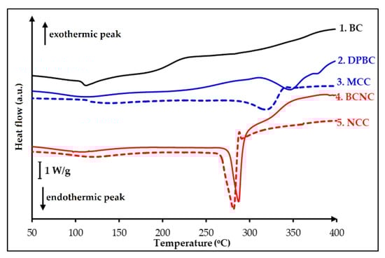 Crystallinity is an important parameter, which can greatly affect the physical properties of biodegradable polymers. The identification of neat polymers, copolymers, polymer blends, and composites, as well as the determination of their purity and stability, are generally described by DSC. Amorphous polymers exhibit a glass transition temperature while crystalline or semi-crystalline polymers may possess glass transition temperature, a freezing and melting temperature with various freezing, and melting enthalpies [56]. In this work, the glass transition temperature, Tg, melting point, Tm, and decomposition temperature, Td were investigated to interpret thermal behaviors of the extracted celluloses. The DSC thermograms for the BC, DP-BC, BC-NC and the reference materials, commercial Microcrystal Cellulose, MCC and Nanocrystal Cellulose, NCC were registered at a heating rate of 10 °C/min and depicted in Figure 3. The thermograms revealed that BC exhibited different pattern from DP-BC and BC-NC. The heat-flow curve of BC displayed a small inflection of the baseline around 105–110 °C, which is the glass transition temperature, Tg, and is followed by an endothermic peak with the onset, Tm = 113.8 °C. In the treated celluloses, DP-BC and BC-NC, with the increased in crystalline content (CrI), the endothermic peak shifted toward a higher temperature. This slightly marked peak could be attributed to the presence of an amorphous region [57]. The curve of DP-BC showed an endothermic peak at 310–370 °C, which appeared to be a melting temperature at Tm = 348.7 °C. The peak was followed by a degradation temperature at Td = 381.3 °C of the cellulosic material. A similar result was found for BC-NC: an endothermic peak was detected around 260–290 °C with the onset temperature at Tm = 282.8 °C then followed by degradation at Td = 318.6 °C. The Tg of both samples, DP-BC and BC-NC disappeared or became difficult to detect because of the partial removal of the amorphous regions.