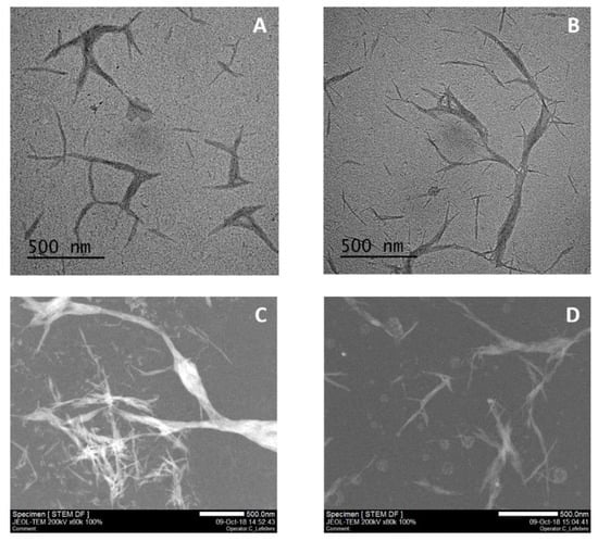 Transmission Electron Microscopy (TEM) and Scanning Transmission Electron Microscopy (STEM) micrograph of BC-NC (A,C) produced with 0.1M HCl and 5% w/w of MnCl2 compare to commercial NCC (B,D).