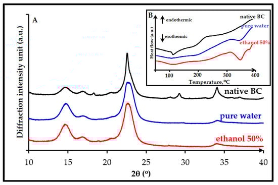 The evolutions of crystalline regions formations for treatment of bacterial cellulose after 30 min irradiation time in pure water (blue curve) or a mixture of ethanol / water 50% (w/w) (red line) observed by XRD (A) and by DSC (B in insert) (untreated BC, dark line).