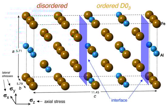 The simulation supercell used in the present work is depicted in Figure 1 together with the cell dimensions and orientation of the coordinate system. This cell is assembled from two parts where the first one corresponds to the ordered FeAl phase with the D0 structure and the second one to the disordered Fe-Al, i.e., a solid solution of Al atoms in bcc Fe with 18.75 at.% Al and the atoms distributed according to the special quasi-random structure (SQS) concept developed by Zunger et al. [61]. The SQS concept is based on the idea that atoms are distributed in a rather small periodically repeated supercell in such a way that their statistical characteristics (average occupations of nearest-neighbor shells, so-called Warren-Cowley short-range order (SRO) parameters) mimic those in an ideal disordered solid solution of atoms with the same chemical composition in an infinitely large system. In order to achieve this goal up to, e.g., second, third or fourth coordination shell, different local atomic environments are typically included. For example, the SQS-part of Figure 1 contains Al atoms distributed in way that they mutually form the first and second nearest neighbor pairs. This is in a clear contrast to the FeAl-part of Figure 1 which contains Al atoms forming solely the third nearest neighbor pairs (a characteristic feature of the D0 structure). The interface between both parts (the blue plane) is located in the middle and due to application of the periodic boundary conditions in ab initio simulations is also located at the cell edges with respect to the z direction.