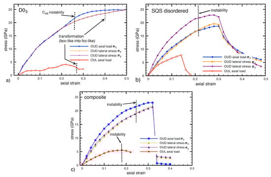 It is worth noting that the expected maxima of the axial strain for the OUD model in Figure 2 is located in rather large values of the axial strain. The strain in the direction [001] is, in fact, comparable with deformations related to the Bain’s transformation path when the bcc lattice transforms into the fcc one. Indeed, in the case of bcc-based D0 structure these conditions occur for the OUD model when the axial strain reaches value () [67,68,69]. Beyond this value the structure cannot be considered as D0 and hence the axial stress at this transformation point may be considered as the theoretical tensile stress . The axial strains corresponding to the Bain’s deformation path are marked in Figure 2a by black vertical dashed line and the corresponding tensile strength for the OUD model is determined in the case of FeAl to be 24.7 GPa. There is also a question whether the D0 is elastically stable for such large strain values. We will focus on this question in Section 3.5.