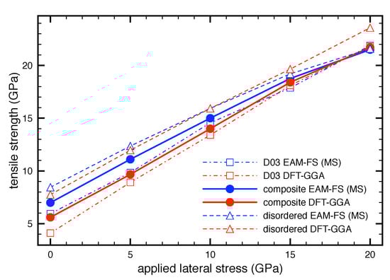 The obtained tensile strength as a function of the lateral stress is illustrated in Figure 3 for FeAl, disordered Fe-Al phase as well as their nanocomposite. Here, the red curves represent the data obtained from the quantum-mechanical simulations whereas the blue ones are the data from the molecular quasi-static simulations. From these dependencies it is obvious that the tensile strength for all structures linearly increases with increasing of the lateral stress and therefore it can be approximated by linear functions using the formula