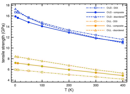 The tensile strength of FeAl and disordered Fe-Al phases together with their nanocomposite as functions of the temperature (the simulations were performed for 1, 10, 50, 100, 200, 300 and 400 K). Blue and yellow curves show the results obtained within OUD and OUL, respectively.