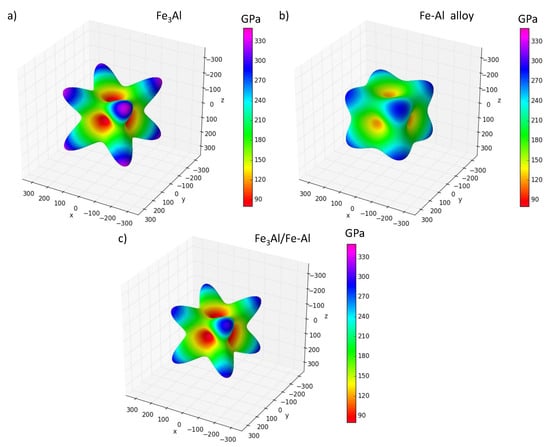 Directional dependencies of Young’s modulus of the ground-state configuration of FeAl compound (a); disordered Fe-Al (b) and the nanocomposite consisting of these two phases (c). All three dependencies were visualized using the SC-EMA software package (see it freely available at the web page scema.mpie.de) [88,89,90].