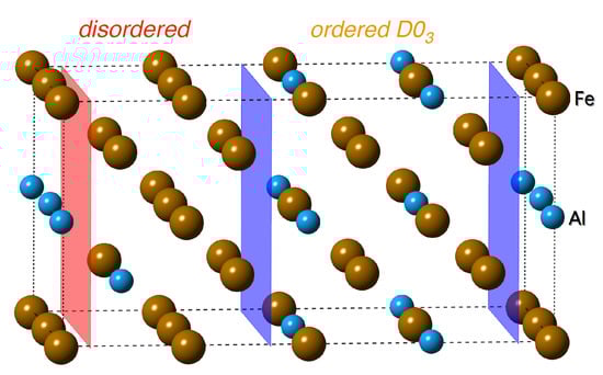- Oguma, R.; Matsumura, S.; Eguchi, T. Kinetics of B2-and D03 type ordering and formation of domain structures in Fe-Al alloys. J. Phys. Condens. Matter 2008, 20, 275225. [Google Scholar] [CrossRef] [PubMed]