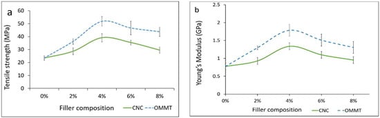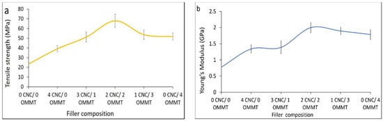 Cellulose nanocrystal (CNC) and organically modified montmorillonite (OMMT) hybridization effects on (a) tensile strengths; and (b) Young’s modulus of hybrid bionanocomposites.